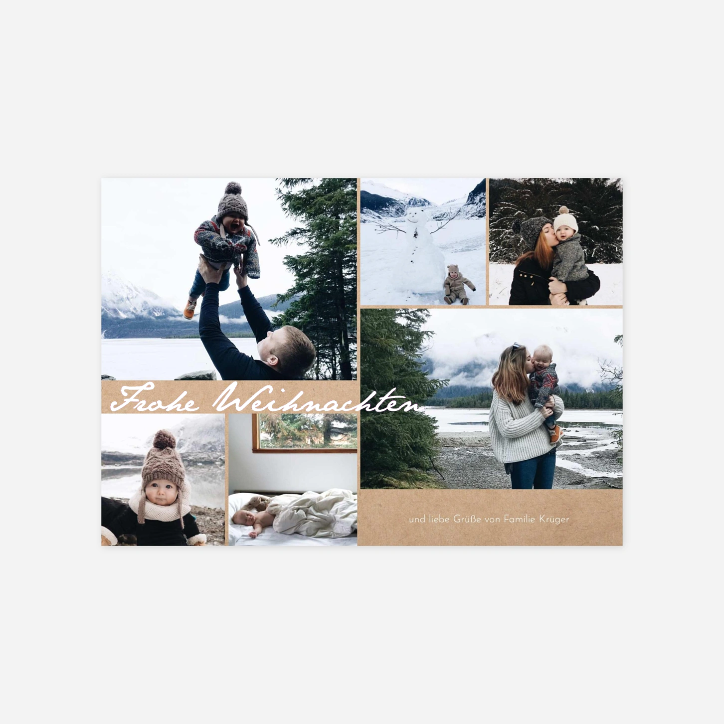 Die Weihnachtskarte "Festlicher Zauber" ist eine wundervolle Collage, die Ihre schönsten Wintermomente und Familienerinnerungen auf stilvolle Weise vereint. Das warme Design bietet viel Platz für persönliche Aufnahmen und herzliche Weihnachtsgrüße an Ihre Liebsten. Da uns Ihre besonderen Augenblicke am Herzen liegen, werden alle Karten in unseren hauseigenen Ateliers mit größter Sorgfalt für Sie gedruckt. Vertrauen Sie auf unsere Expertise und lassen Sie Ihre individuellen Weihnachtskarten in erstklassiger Qualität bei uns fertigen. Gestalten Sie Ihr persönliches Kartenset jetzt ganz einfach online in unserem Editor.