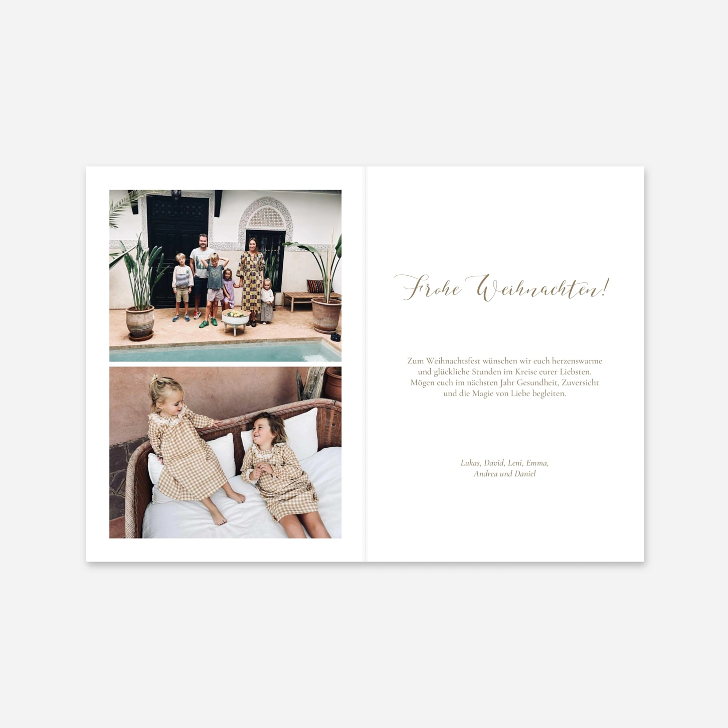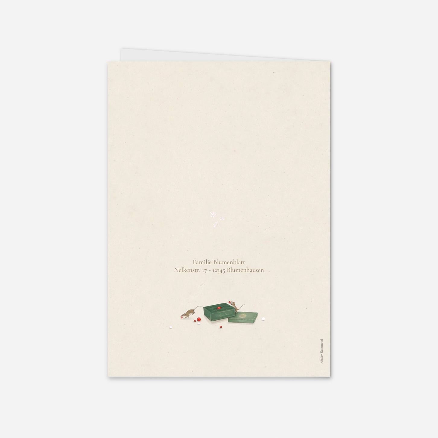 Die Weihnachtskarte "Festliches Funkeln" sorgt mit ihrem liebevoll illustrierten Weihnachtsbaum, der von kleinen Waldbewohnern festlich geschmückt wird, für eine stimmungsvolle Weihnachtsatmosphäre. Dieses nostalgische Motiv verbindet festliche Eleganz mit einer warmen Portion Fantasie und eignet sich perfekt, um herzliche Grüße an Familie und Freunde zu senden. Gefertigt in unseren eigenen Werkstätten in Frankreich und Deutschland, vereint die Karte bezauberndes Design mit höchster Druckqualität.