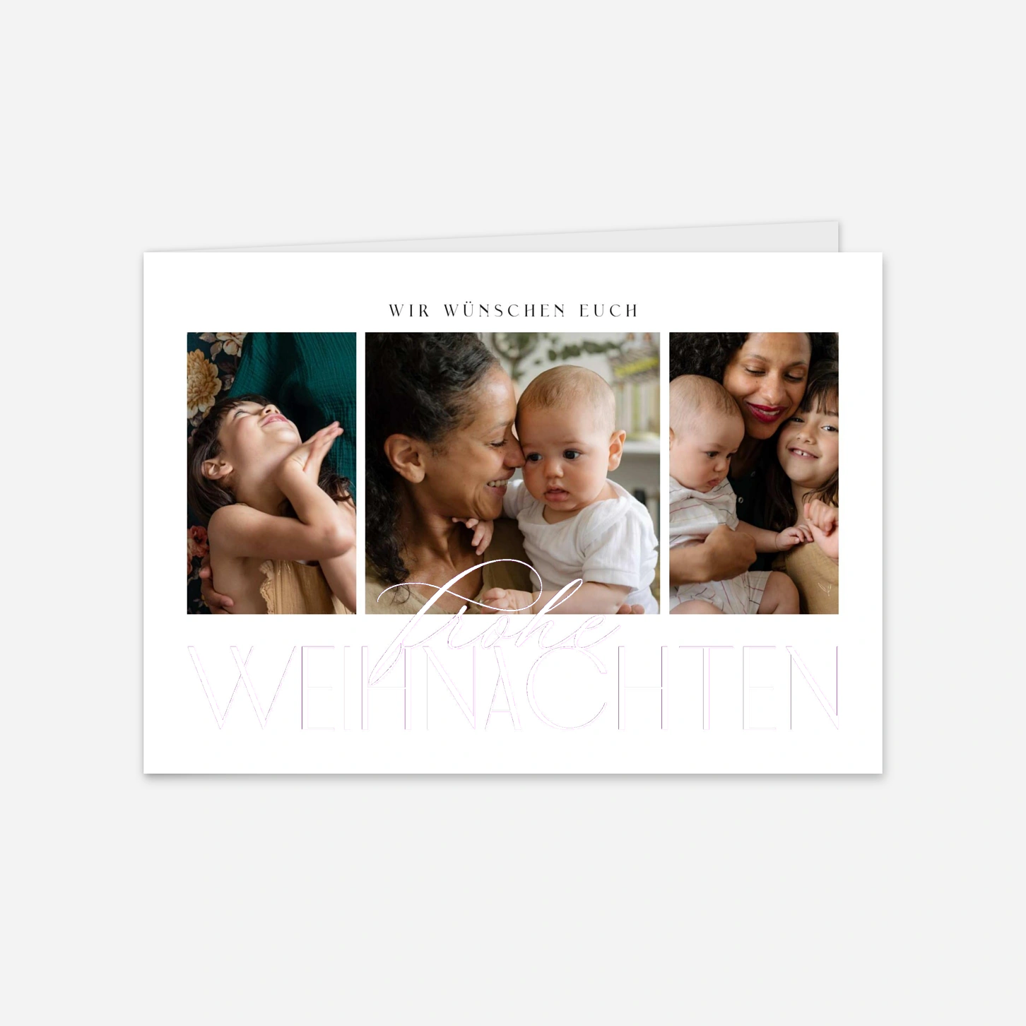 Die Weihnachtskarte "Fine Art" strahlt eine moderne Eleganz aus und setzt Ihre schönsten Familienfotos stimmungsvoll in Szene. Mit ihrer klaren Typografie und der edlen Gestaltung eignet sie sich perfekt, um herzliche Weihnachtsgrüße an Ihre Liebsten zu versenden. Unsere Karten werden in unseren eigenen Werkstätten in Deutschland und Frankreich mit höchster Sorgfalt produziert. Gestalten Sie Ihre Weihnachtskarte online und überbringen Sie Ihre Wünsche zum Fest auf besonders stilvolle Weise.