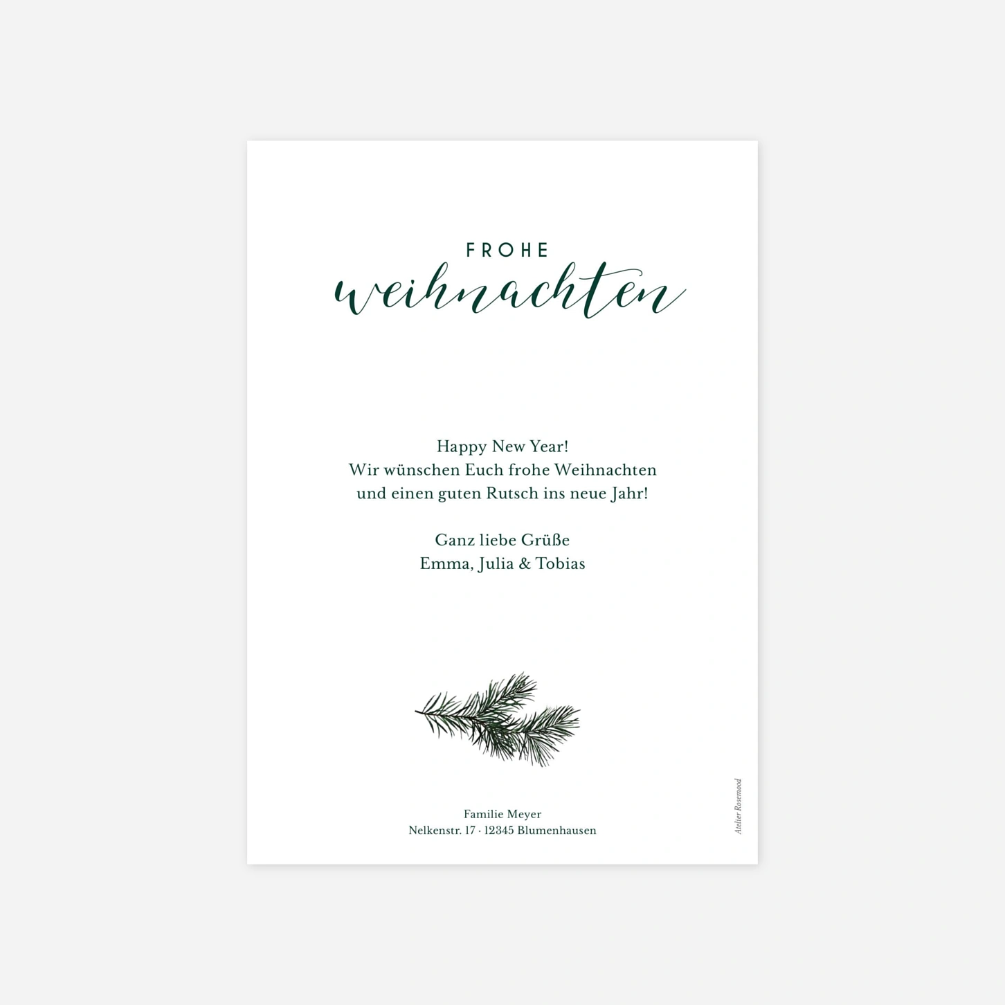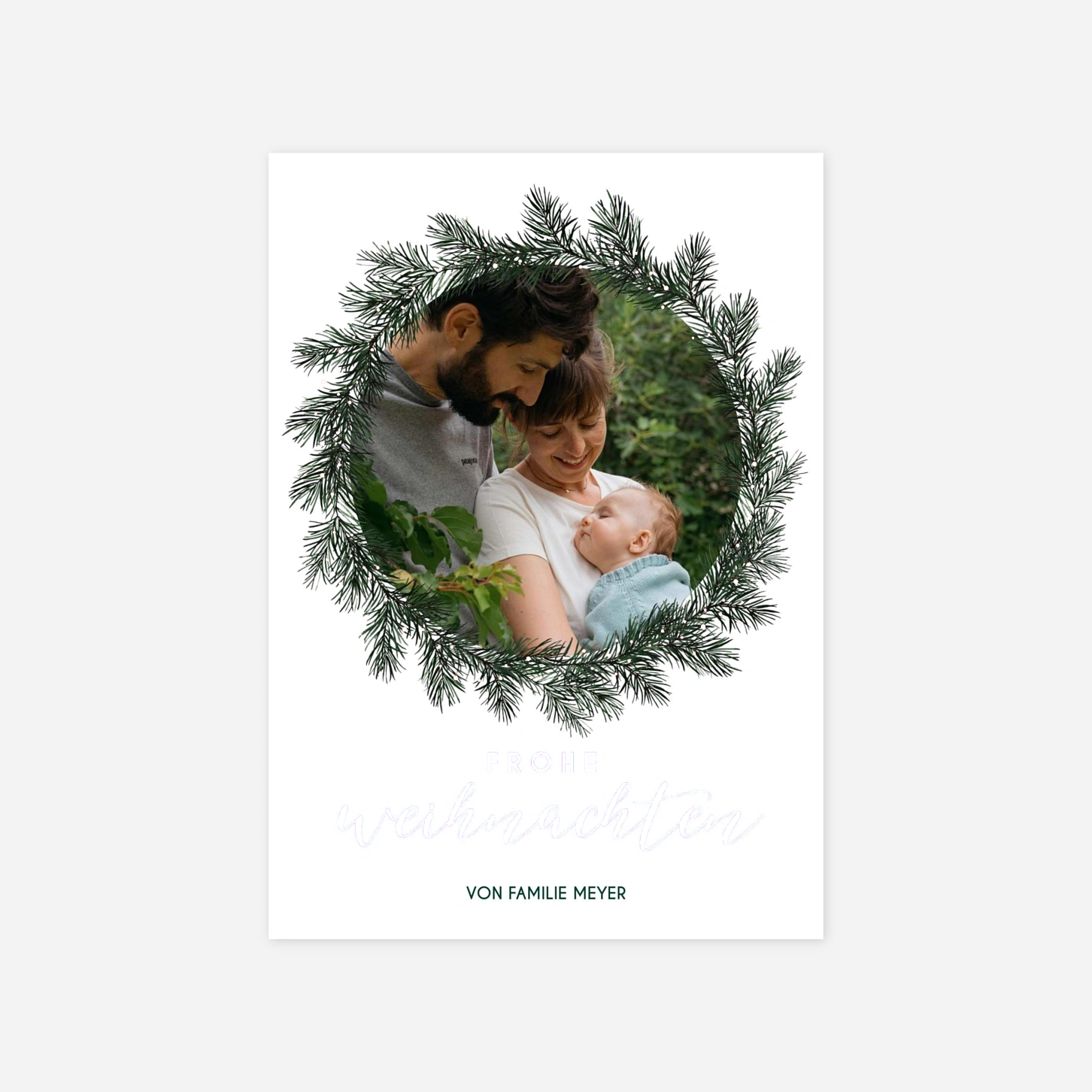 Die Weihnachtskarte "Frohe Festzeit" besticht durch einen handgezeichneten Kranz aus feinen Tannenzweigen, der Ihr liebstes Familienfoto auf herzliche Weise einrahmt. Diese festliche Karte bietet den idealen Rahmen, um Ihre Weihnachtsgrüße stilvoll zu versenden und das vergangene Jahr Revue passieren zu lassen. In unseren hauseigenen Ateliers achten wir auf höchste Präzision, damit Ihre persönlichen Botschaften auf unseren Premium-Papieren perfekt zur Geltung kommen. Gestalten Sie Ihre individuelle Weihnachtskarte jetzt online und bereiten Sie Ihren Liebsten eine besondere Freude zum Fest.