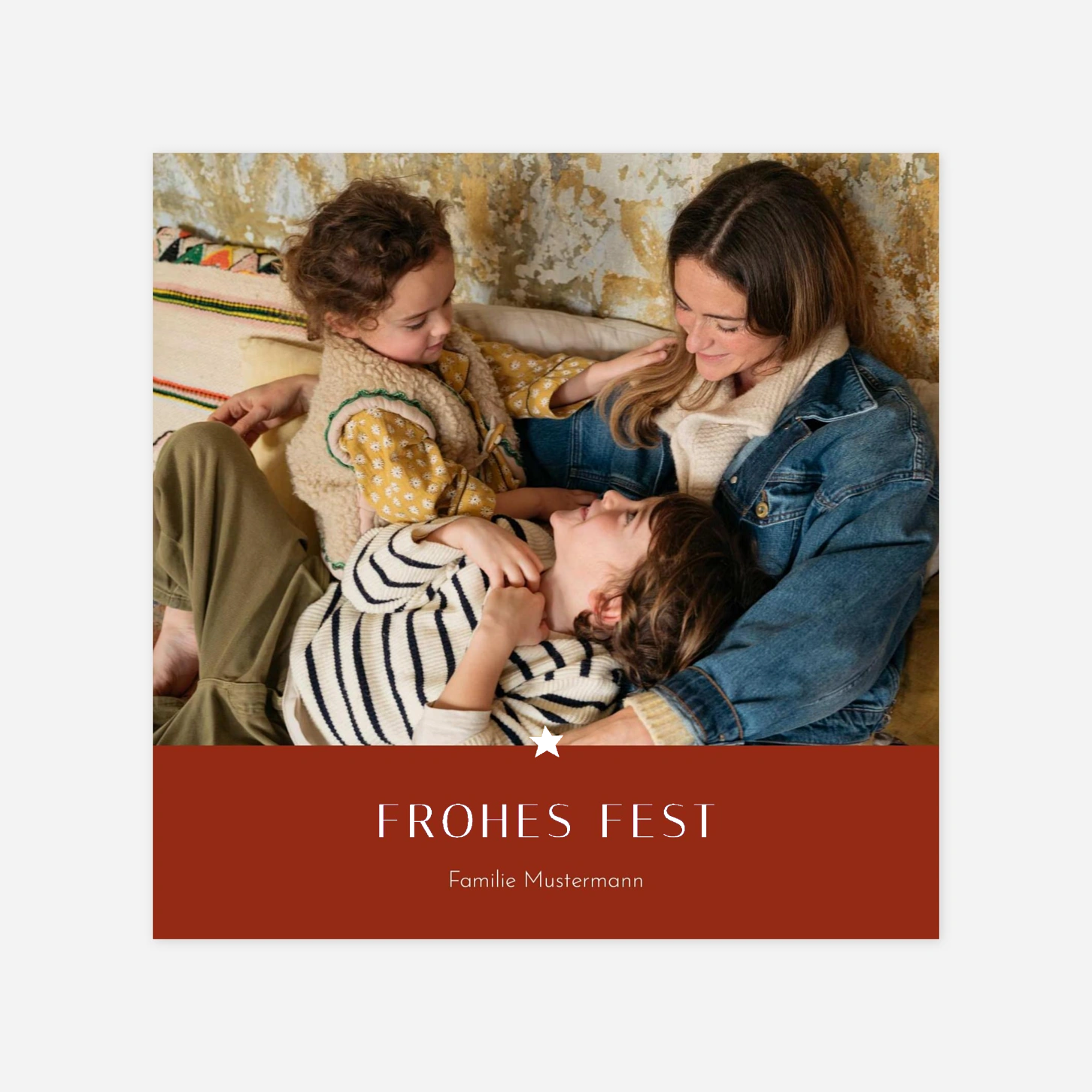Die Weihnachtskarte „Goldstern” ist eine stilvolle und elegante Möglichkeit, um Ihren Lieben herzliche Festtagsgrüße zukommen zu lassen. Die quadratische Karte wurde von unserem hauseigenen Designteam Le Collectif entworfen und bietet auf der Vorderseite ausreichend Platz, um ein schönes Foto groß in Szene zu setzen. Darunter findet Ihr Text auf einem farblich hinterlegten Feld Platz. Sie haben die Wahl, ob Sie dieses in einem kräftigen Blau, einem festlichen Rot oder einem eleganten Gold bevorzugen. Die Rückseite bietet dann Raum für ein weiteres Foto und Ihre persönliche Botschaft an Freunde und Familie. Entscheiden Sie sich zunächst für eine Farbversion, dann können Sie auch schon mit der Gestaltung Ihrer Weihnachtskarte in unserem praktischen Online-Editor beginnen. Natürlich können Sie alle Elemente anpassen und ganz nach Ihren Vorstellungen personalisieren. So entsteht eine individuelle Karte, die zu Ihnen passt und Ihre Lieben verzaubern wird. Falls Sie sich zunächst einen persönlichen Eindruck von Ihrer Karte verschaffen möchten, um sie einmal in der Hand zu halten sowie um Druckqualität und Haptik besser beurteilen zu können, können Sie gerne einen personalisierten Probedruck bestellen. Dieser ist für Sie natürlich kostenlos.