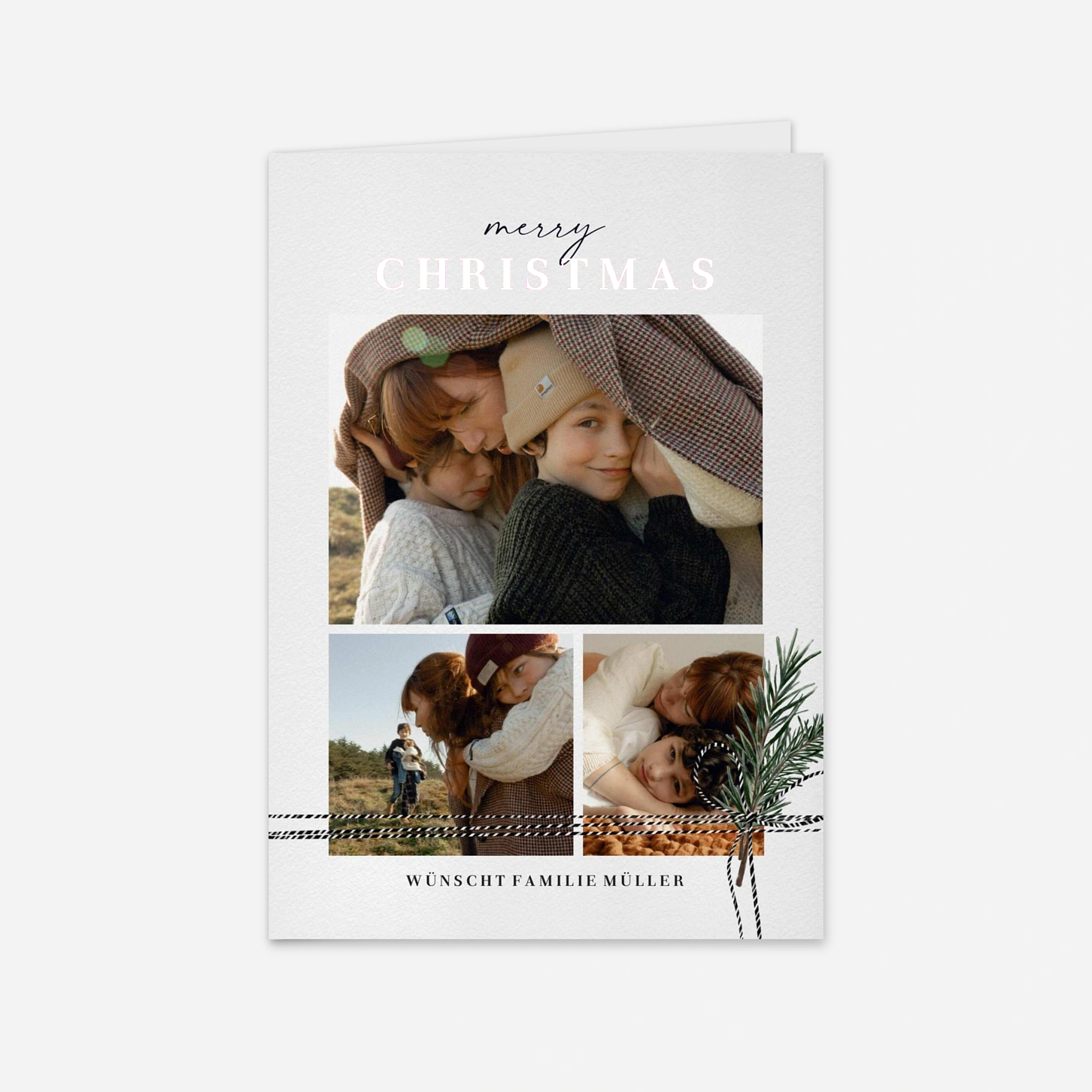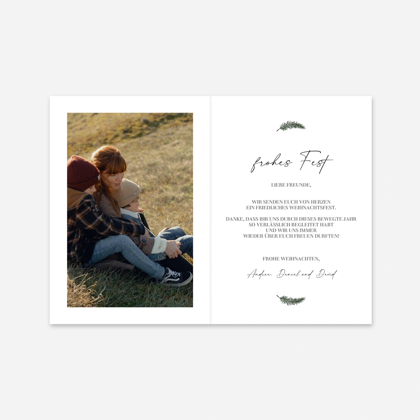 Die Weihnachtskarte "Herzensgeschenk" fängt die wohlige Atmosphäre der Festtage mit einem liebevollen Fotolayout und herbstlich-winterlichen Akzenten perfekt ein. Das Design bietet reichlich Platz für Ihre schönsten Familienmomente und wird durch zarte Illustrationen von Tannenzweigen sowie einer eleganten Typografie stimmungsvoll abgerundet. Jede Karte wird mit höchster Präzision in unseren eigenen Produktionsstätten in Deutschland und Frankreich für Sie gefertigt. Vertrauen Sie auf unsere langjährige Expertise und erstklassige Druckqualität, wenn Sie Ihre individuelle Weihnachtskarte gestalten möchten. Gestalten Sie Ihr persönliches Kartenset jetzt online und versenden Sie herzliche Grüße an Ihre Liebsten.