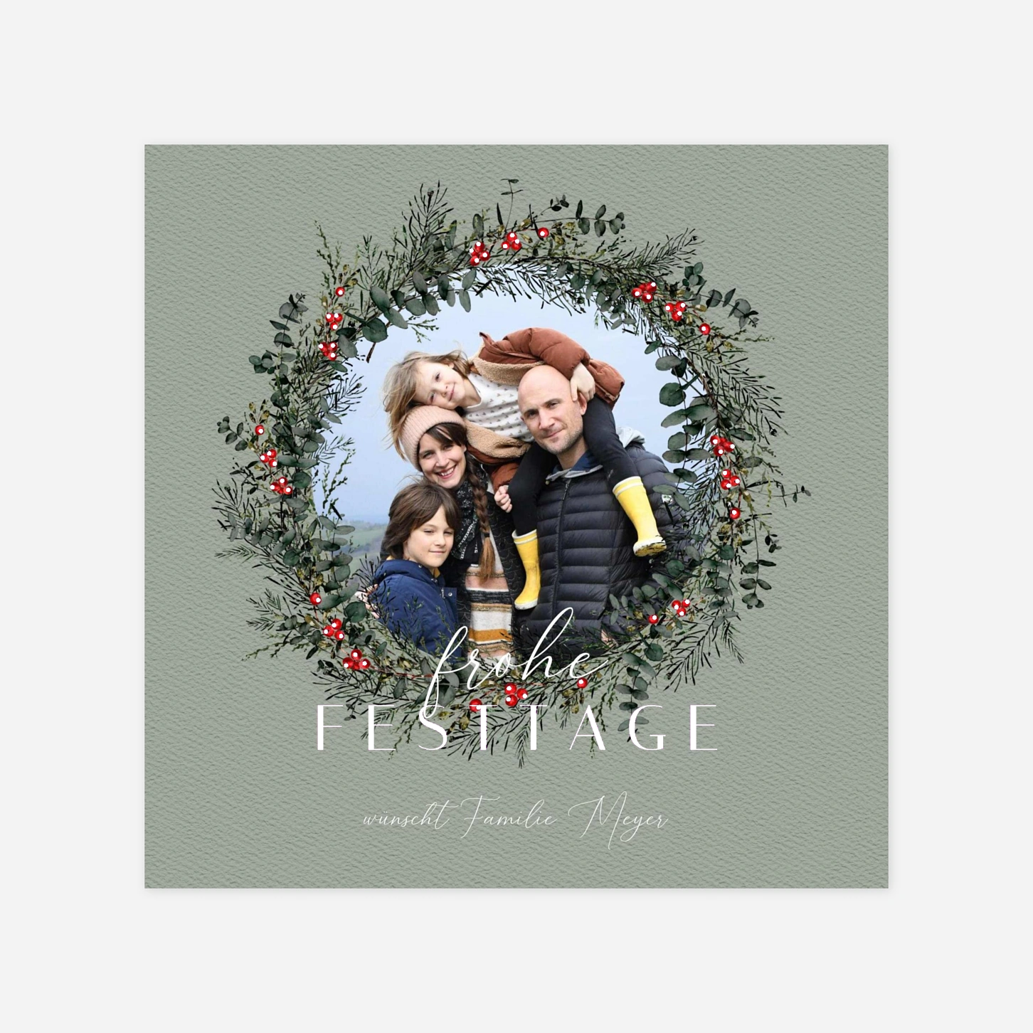 Übermitteln Sie Ihre festlichen Grüße mit der Weihnachtskarte "Immergrün", die durch ihren detailreichen, naturverbundenen Kranz aus Tanne und roten Beeren eine wunderbar herzliche Atmosphäre schafft. Das elegante Design rahmt Ihr liebstes Familienfoto perfekt ein und lässt Ihre Weihnachtsgrüße in einem stilvollen Glanz erstrahlen. In unseren hauseigenen Ateliers entworfen, garantieren wir Ihnen eine hochwertige Qualität für Ihre persönliche Weihnachtspapeterie. Jede Karte wird mit größter Präzision in unseren eigenen Produktionsstätten in Deutschland und Frankreich für Sie gefertigt. Gestalten Sie Ihr individuelles Set jetzt online und bereiten Sie Ihren Liebsten eine besondere Freude zum Fest.