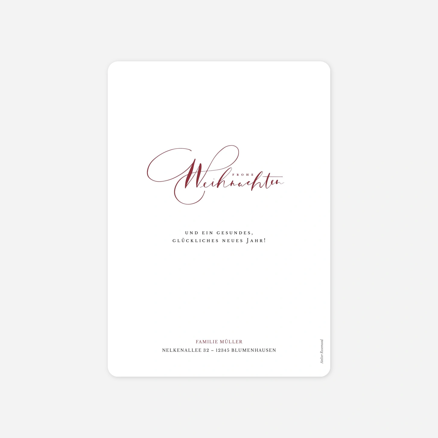 Die Weihnachtskarte "Lettering" verbindet schlichte Eleganz mit festlicher Wärme. Ihr persönliches Foto steht im Mittelpunkt und wird von einer schwungvollen Typografie begleitet, die den Zauber der Feiertage perfekt einfängt. Mit dieser Karte senden Sie nicht nur liebevolle Weihnachtsgrüße, sondern auch einen Hauch stilvoller Individualität. Gedruckt wird in unseren eigenen Werkstätten in Deutschland und Frankreich – so entsteht ein hochwertiges Ergebnis, das Freude bereitet.