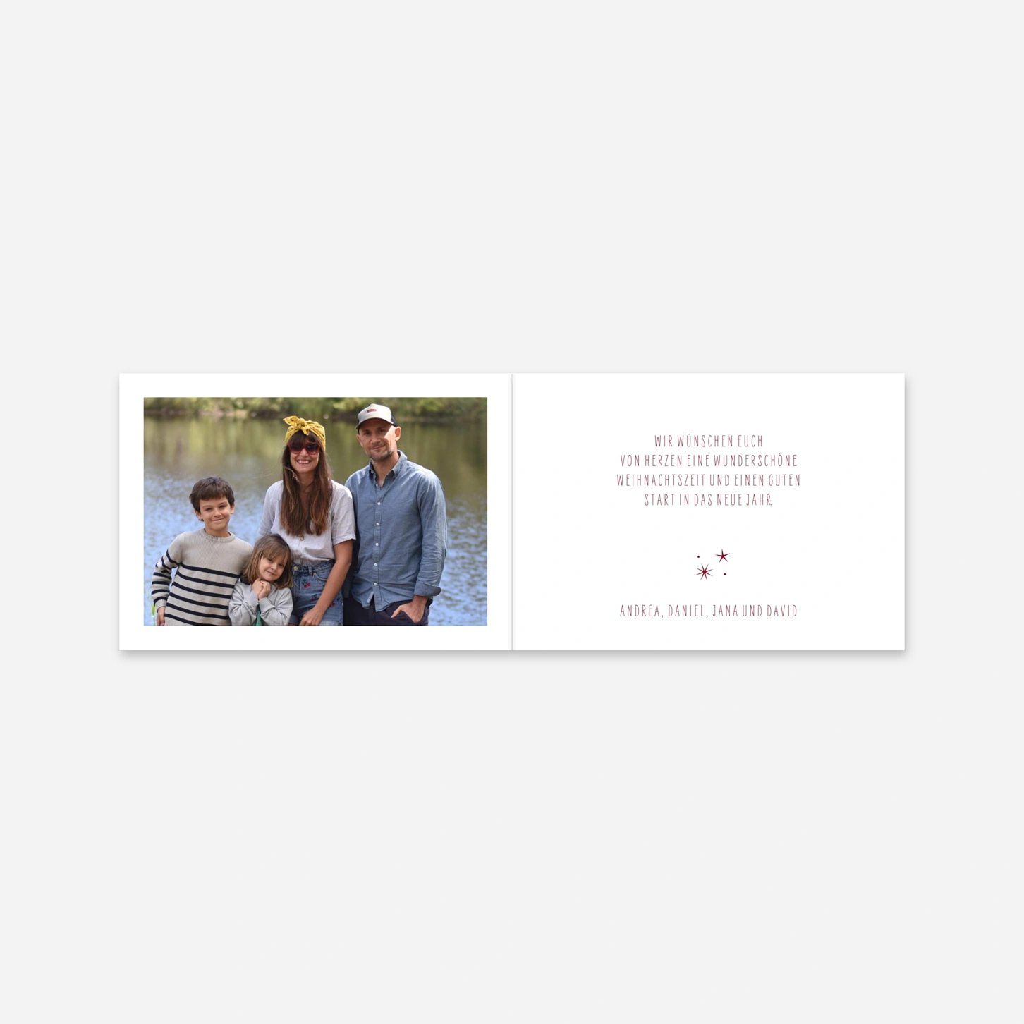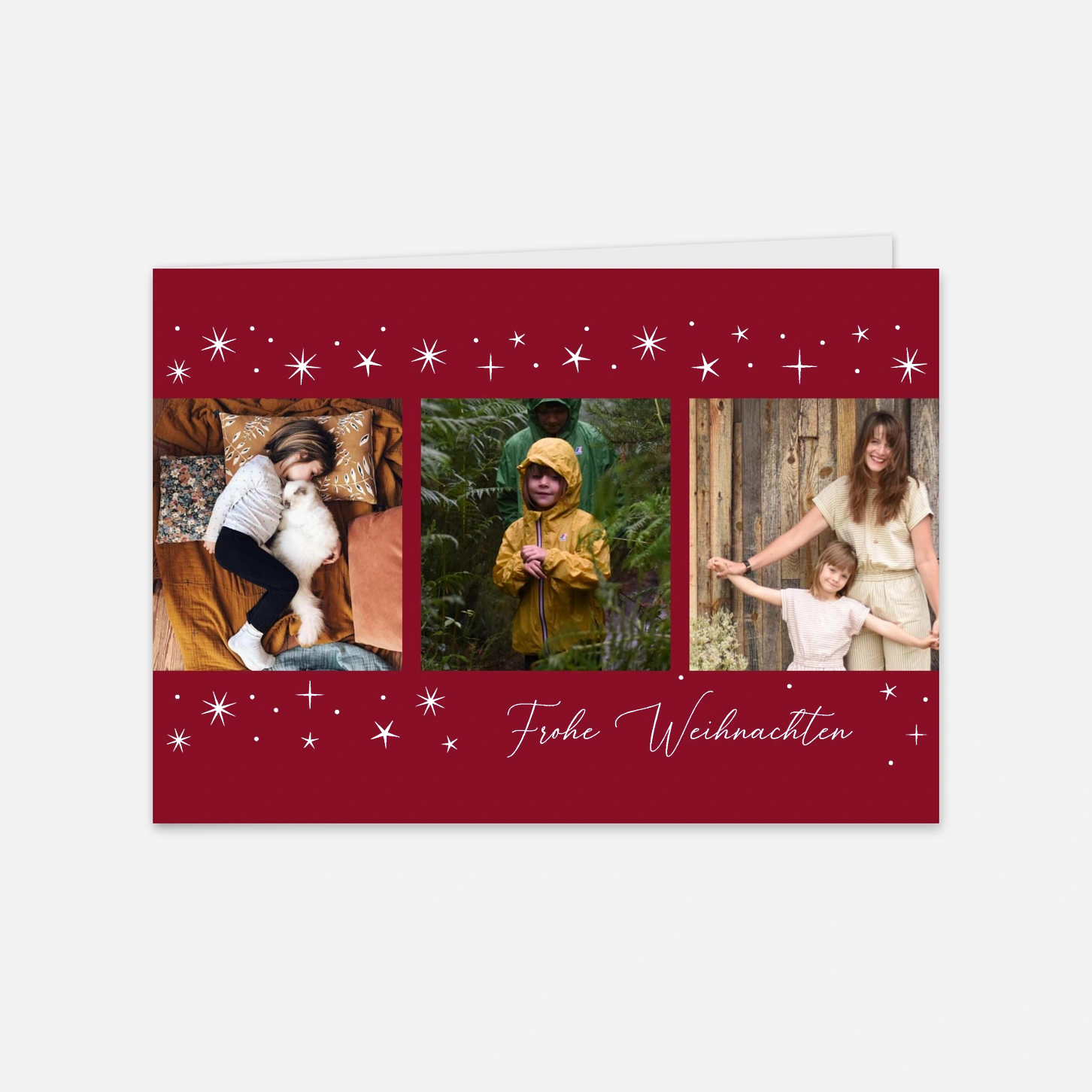 Teilen Sie Ihre schönsten Familienmomente des vergangenen Jahres mit der Weihnachtskarte "Lichterglück", die durch ihre edle Gestaltung und funkelnde Sternendetails besticht. Das moderne Layout bietet Platz für mehrere Fotos auf der Vorder- und Innenseite, um Ihre Weihnachtsgrüße besonders persönlich und herzlich zu übermitteln. Wir produzieren Ihre Karten mit höchster Präzision in unseren hauseigenen Ateliers in Deutschland und Frankreich, um eine exzellente Druckqualität auf unseren Premium-Papieren zu garantieren. Vertrauen Sie auf unsere Expertise und Leidenschaft für schönes Design, wenn Sie Ihre individuellen Weihnachtsgrüße gestalten. Möchten Sie direkt online loslegen und Ihre persönliche Karte mit nur wenigen Klicks erstellen?