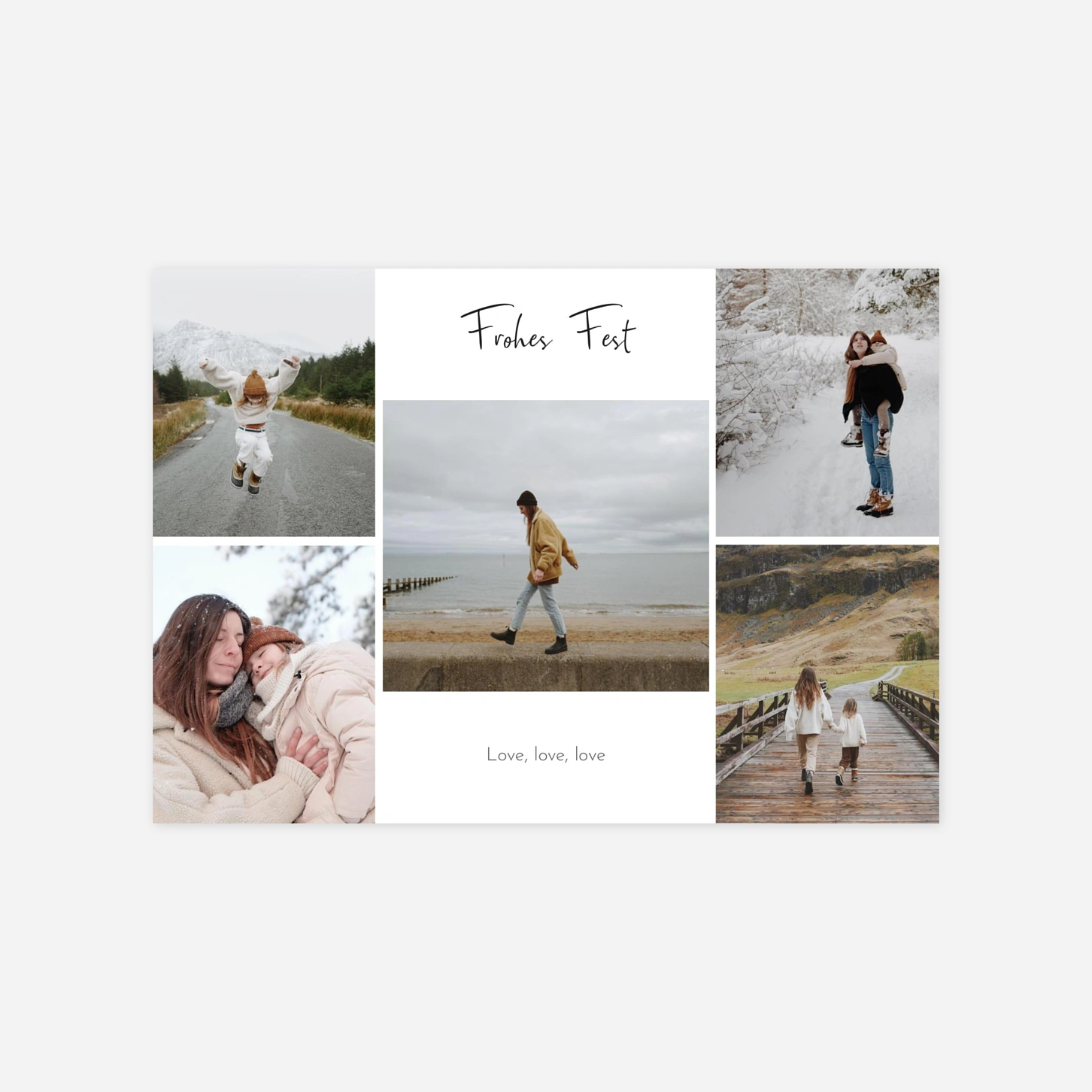 Verschicken Sie unsere Weihnachtskarte Momentaufnahmen (lang) und bringen Sie Ihre Freunde und Familie in Weihnachtsstimmung. Die originelle Weihnachtskarte wurde von unserem hauseigenen Designteam Le Collectif mit viel Liebe zum Detail entworfen. Auf der Vorderseite werden fünf Ihrer schönsten Fotos mit zwei Textfeldern zu einer Collage kombiniert. Für die Farbe der Textfelder können Sie zwischen einem winterlichen Blau, einem schlichten Weiß oder unserem Kraftpapier-Look wählen. Auf der Rückseite der Weihnachtskarte ist viel Platz, um ein weiteres Foto ins Rampenlicht zu stellen. Außerdem finden Ihre Liebsten einen persönlichen Weihnachtsgruß in Kalligraphie-Schrift. Natürlich können Sie die Schriftart und -größe in unserem Online-Editor nach Ihren Vorstellungen ganz einfach anpassen. Bei allen weiteren Fragen wenden Sie sich gerne an unseren freundlichen Kundenservice.