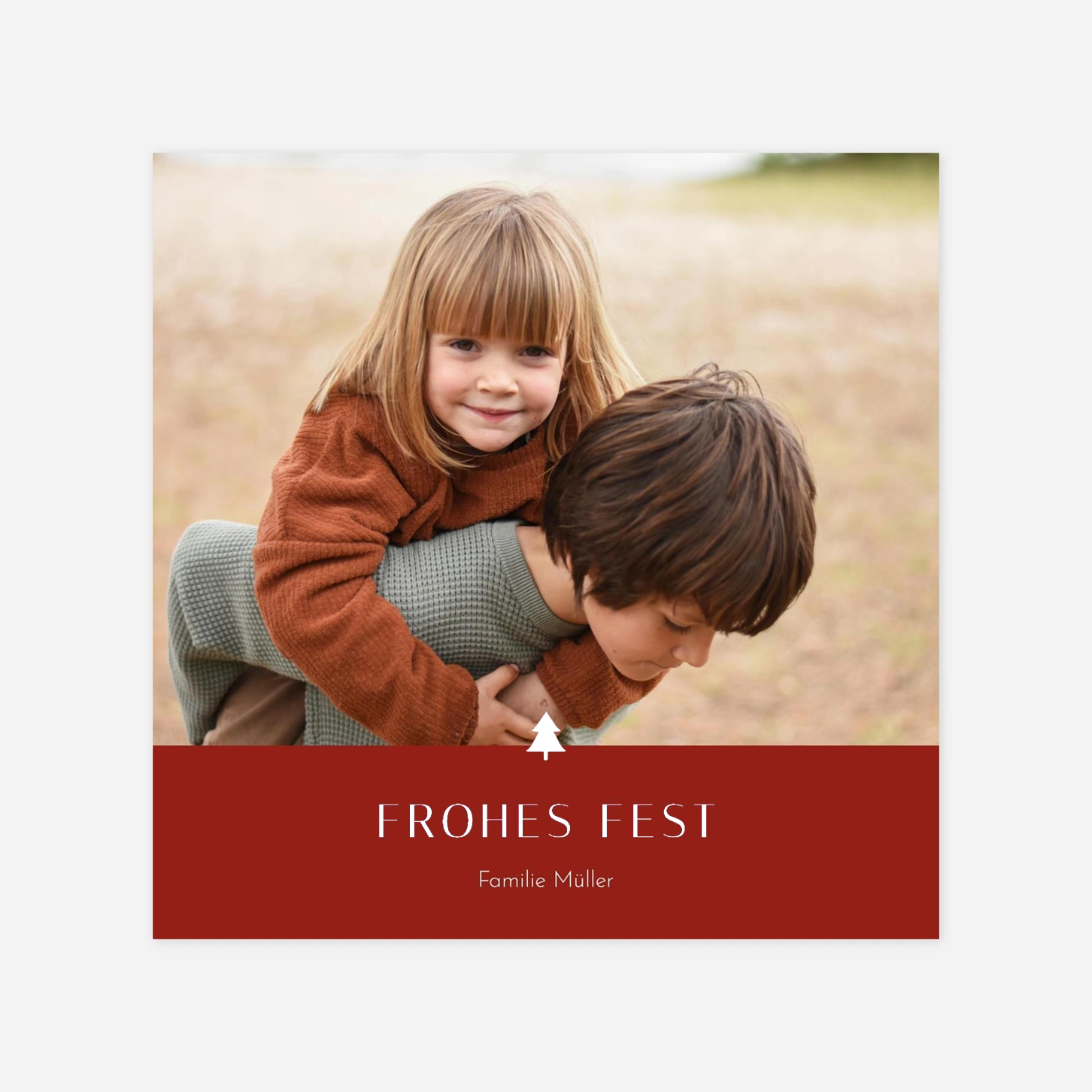 Sie möchten Ihren Lieben einen kleinen Gruß zu Weihnachten schicken und ihnen ein frohes Fest wünschen? Dann eignet sich unsere Weihnachtskarte „Tannenbaum” wunderbar, denn sie versprüht ordentlich Weihnachtsstimmung. Das quadratische Modell wurde von unserem hauseigenen Designteam Le Collectif entworfen und bietet auf der Vorderseite genug Raum für ein schönes Foto. Darunter können Sie einen kurzen Text eintragen. Sie haben die Wahl, ob das Textfeld in einem kräftigen Dunkelgrün, einem festlichen Rot oder einem weihnachtlichen Gold unterlegt werden soll. Auf der Rückseite können Sie ein weiteres Motiv einfügen und eine persönliche Botschaft an Ihre Lieben richten. Natürlich können Sie Ihre Weihnachtskarte in unserem Online-Editor vollständig personalisieren.