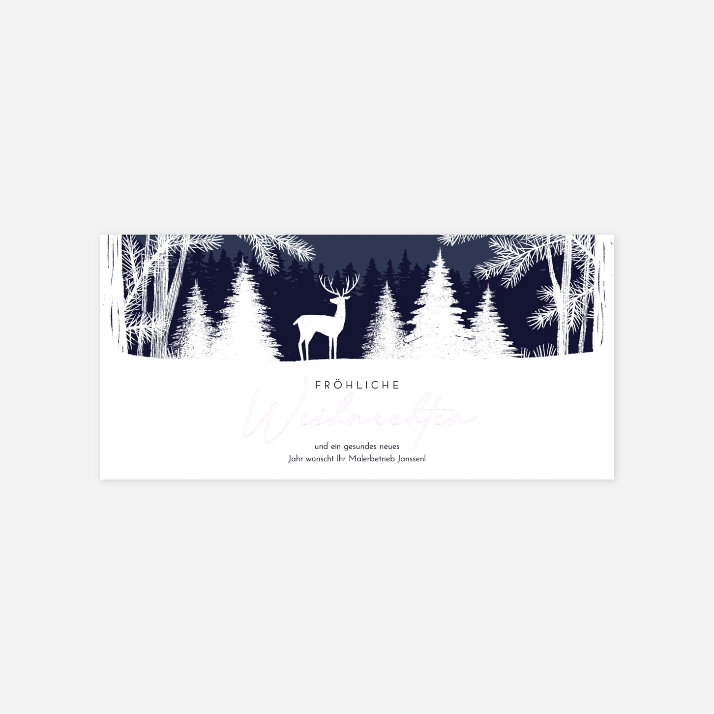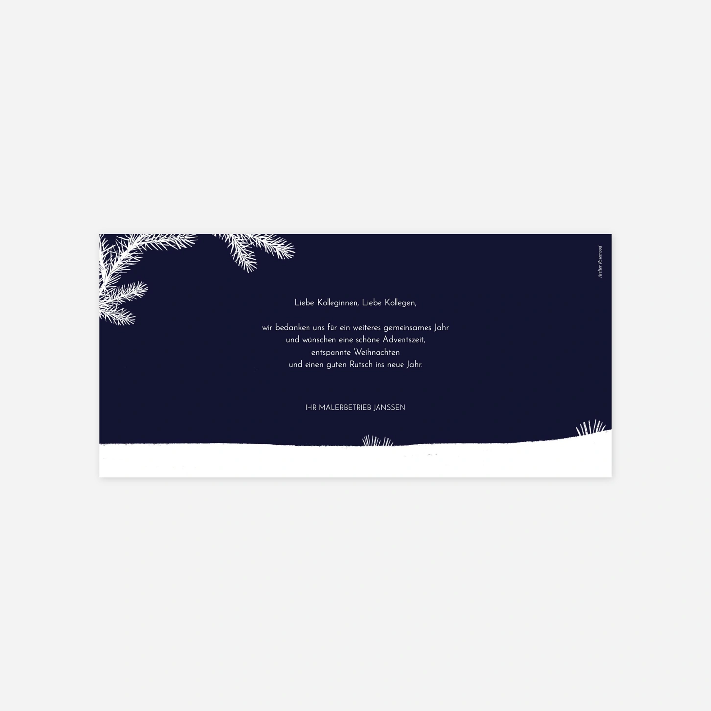 Unsere geschäftliche Weihnachtskarte „Schneestille“ ist die perfekte Wahl, um Kundinnen, Kunden oder Geschäftspartnern stilvoll Danke zu sagen. Das Design vereint festliche Eleganz mit einer persönlichen Note und überbringt Ihre Weihnachtsgrüße auf besonders ansprechende Weise. Passen Sie Text und Gestaltung einfach online an und verleihen Sie Ihrer Karte eine individuelle Note. Gedruckt wird mit höchster Präzision in unseren eigenen Ateliers in Deutschland und Frankreich. Gestalten Sie Ihre Firmen-Weihnachtskarten jetzt ganz nach Ihrem Geschmack.